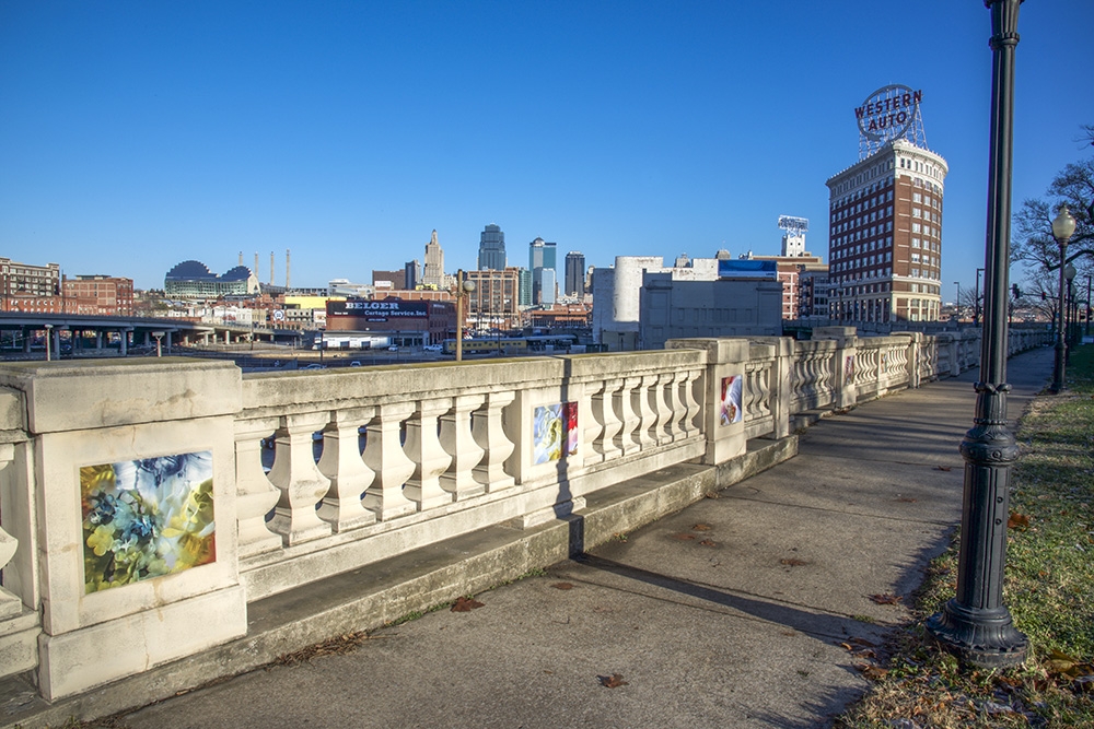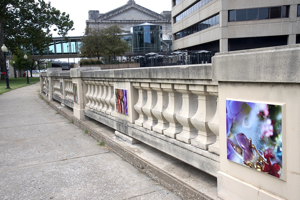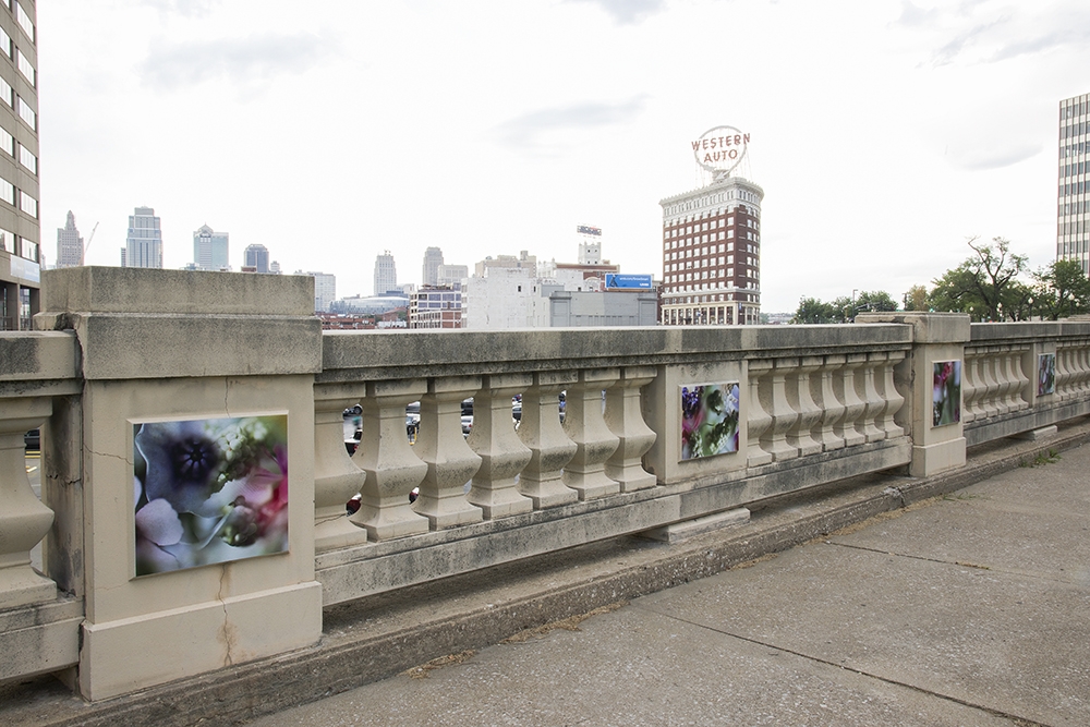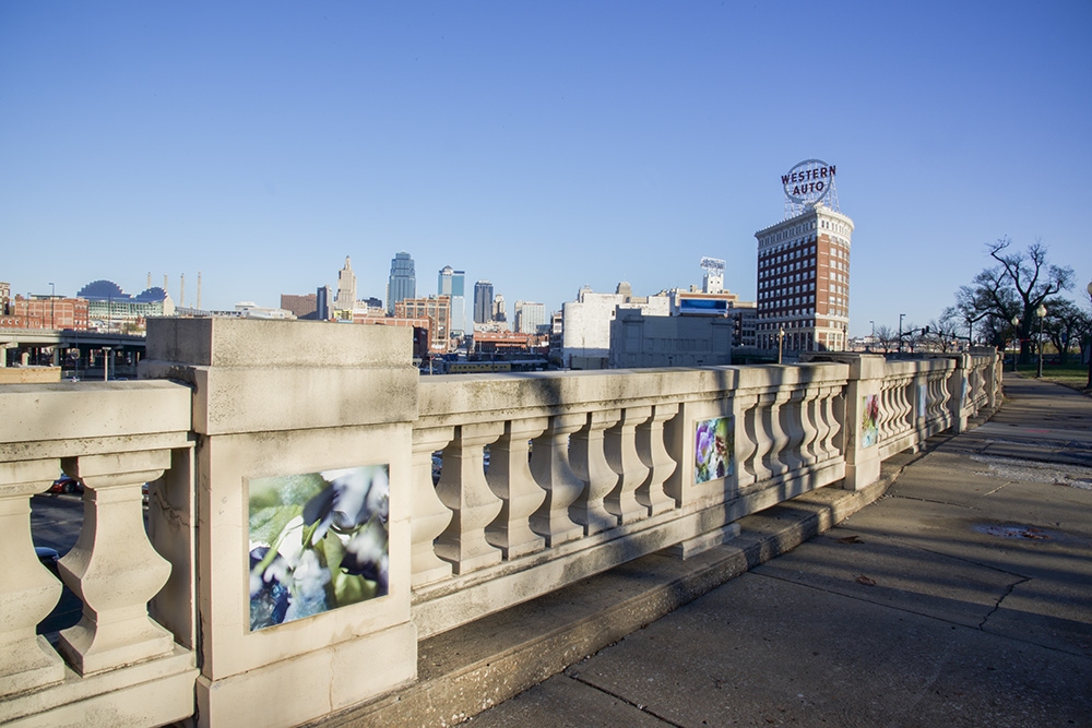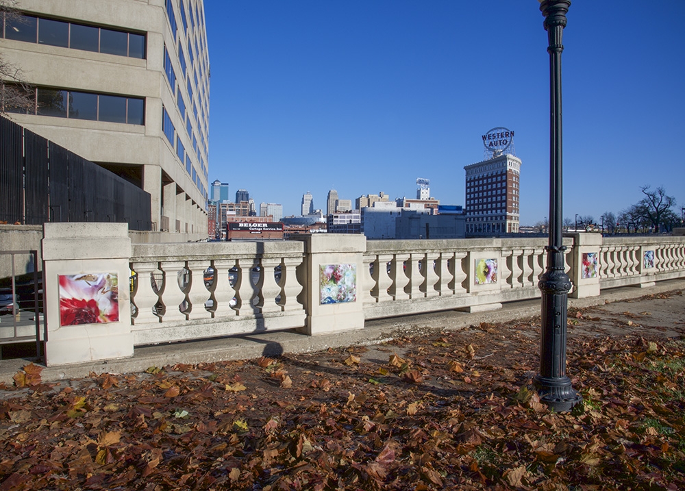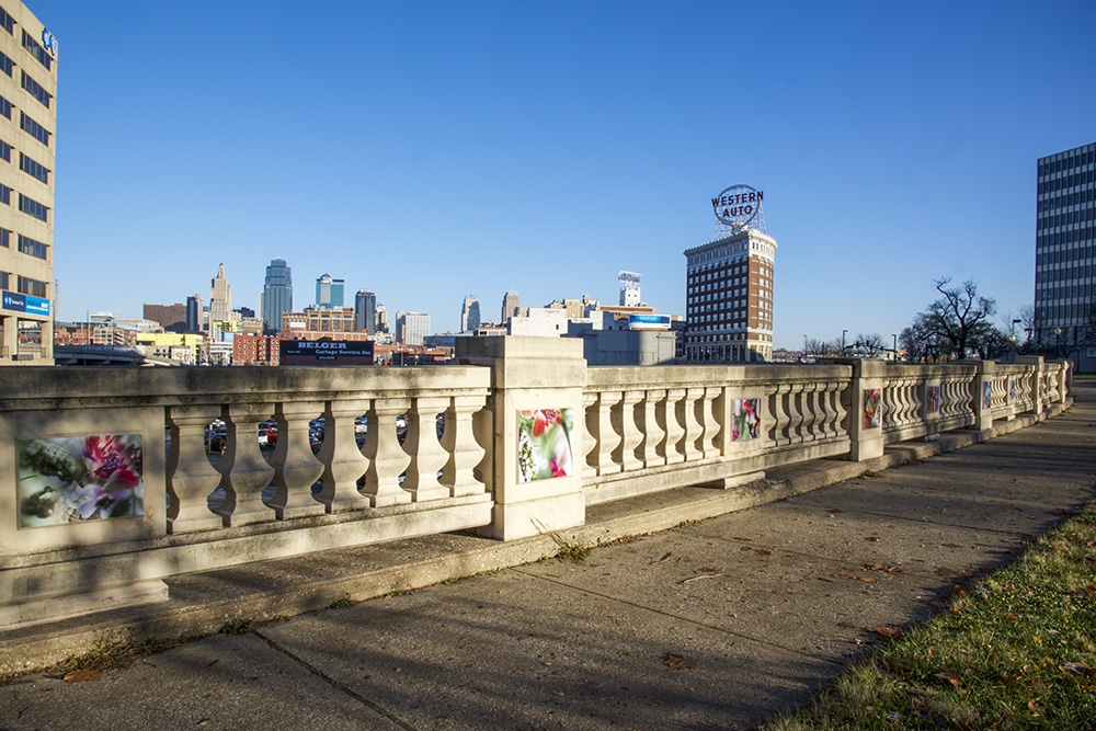This site-specific public art installation features a set of seventy images displayed on the flat panels of the North wall in Washington Square Park. With surroundings of mostly grass and very few flowers, this project aims to embolden the curved path along the railroad tracks. Sensuous imagery softens the hard and mostly cast-concrete materials of the park environment. The imagery draws visitors’ attention to the city’s skyline with its classic Western Auto sign along with the new Kauffman Center for the Performing Arts.