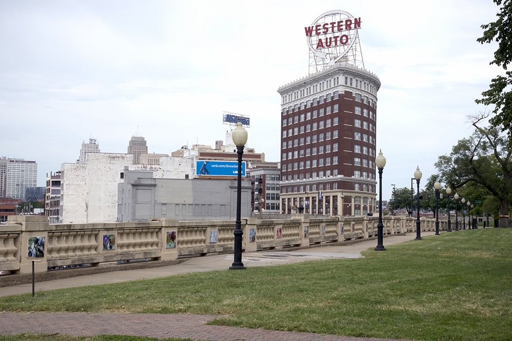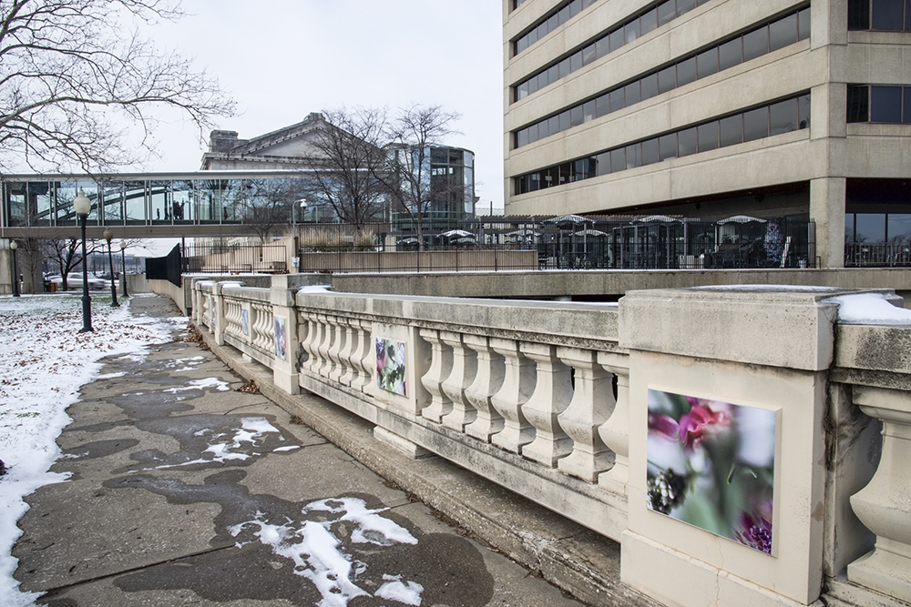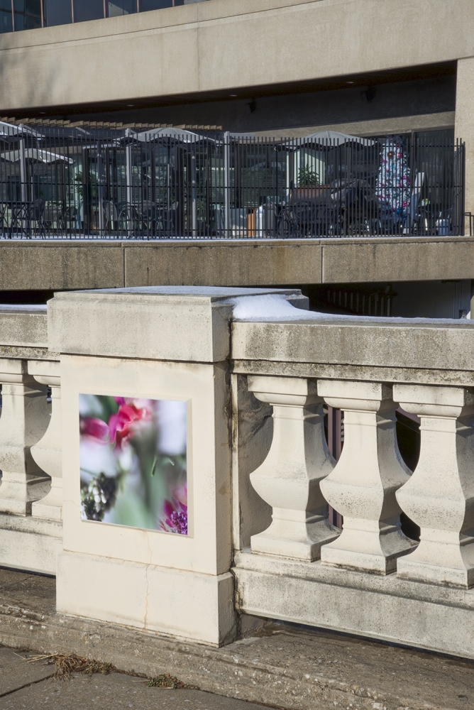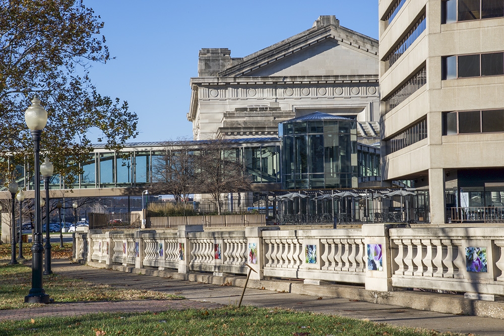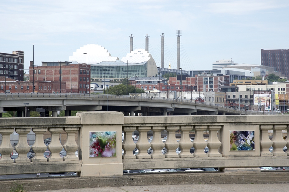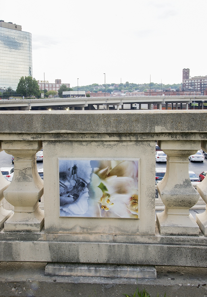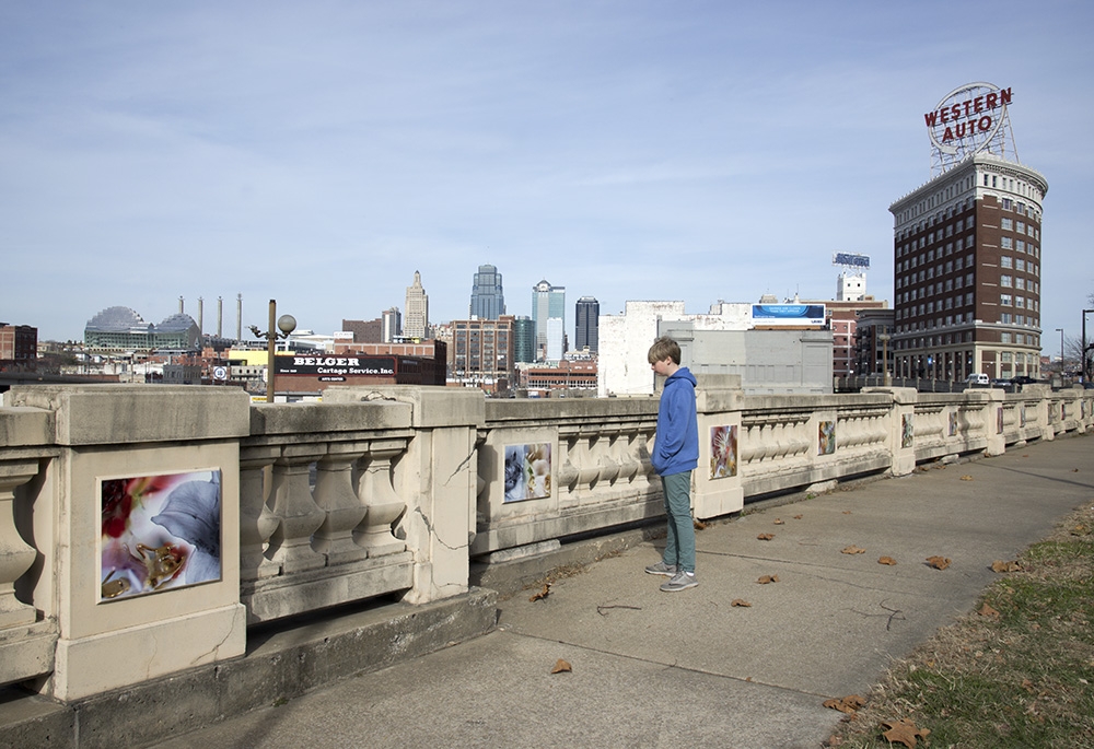 This site-specific public art installation features a set of seventy images displayed on the flat panels of the North wall in Washington Square Park. With surroundings of mostly grass and very few flowers, this project aims to embolden the curved path along the railroad tracks. Sensuous imagery softens the hard and mostly cast-concrete materials of the park environment. The imagery draws visitors’ attention to the city’s skyline with its classic Western Auto sign along with the new Kauffman Center for the Performing Arts.