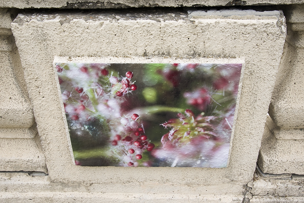 I create imagery from photographs taken with a macro lens of mostly artificial representation of live subjects (flowers, berries, leaves). With complex digital layering the imagery emerges vibrant and lively to create the illusion of a flowerbed on the park wall. The compositions appear at once familiar and mysterious, enchanting and disorienting.